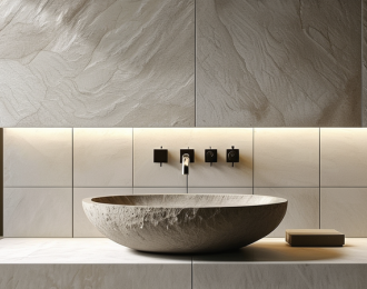 轻奢风卫浴的极致体验:一体式岩板台盆与墙面瓷砖的统一设计。