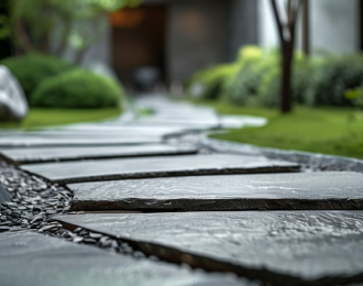 新中式玄关的迎宾景致:一幅定制瓷砖画与枯山水元素的结合。