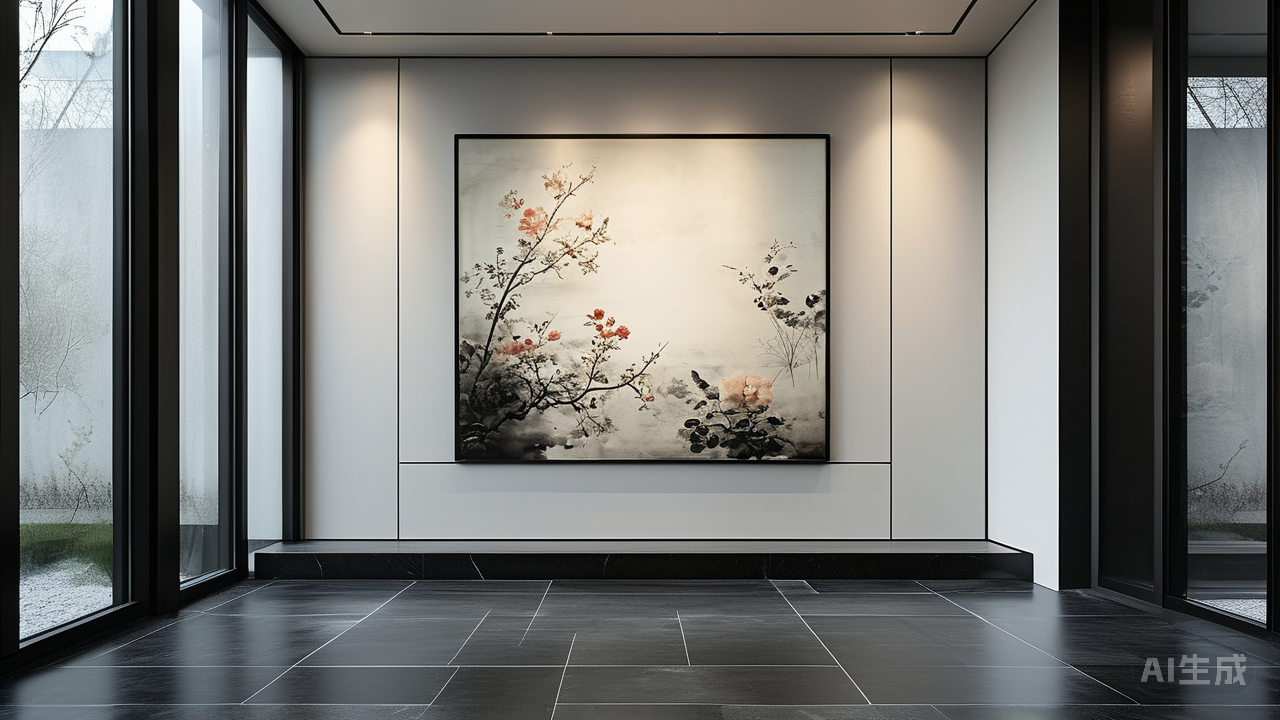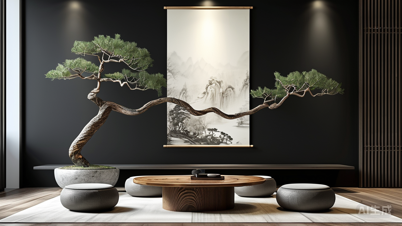 哑光深色瓷砖的低调质感,为新中式空间中的传统元素提供了最沉稳的舞台。一株虬枝斜逸的盆景,在哑光黑背景的衬托下,枝叶的轮廓如工笔描摹般清晰,那份枯山水的禅意得以无限放大。深灰色地面之上,一张温润的明式茶桌、几把线条洗练的圈椅,其木质纹理在深色底布的映衬下愈加温润可亲。而悬挂的素色山水或花鸟画作,其淡雅的墨色与空灵的意境,亦因这哑光深色的烘托而愈显超逸出尘。深色如墨,默默托起空间里每一份雅韵。