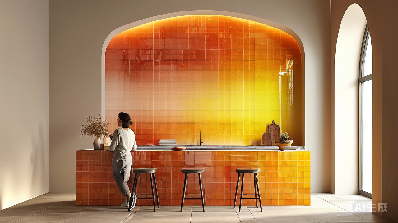 渐变色彩瓷砖应用灵感:仿佛把彩虹铺在了家里,营造梦幻而富有动感的视觉效果阳光透过洁净的落地窗,洒在客厅的地面上,没有投下单一呆板的光斑,而是漾开了一片温柔而富有层次的光晕。这并非魔法,而是渐变色彩瓷砖赋予空间的独特魅力。它不像传统瓷砖那样泾渭分明,而是如技艺精湛的画师用画笔蘸取彩虹,在砖面上进行了一场酣畅淋漓的渲染,让色彩在过渡中呼吸,在融合中舞蹈,仿佛把一抹流动的霞光、一片深邃的海洋,或是一道雨后的虹霓,永恒地定格在了家的方寸之间。