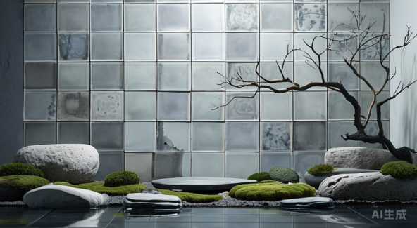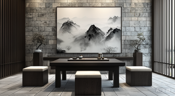 新中式玄关的迎宾景致:一幅定制瓷砖画与枯山水元素的结合。
