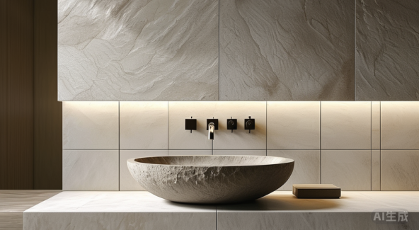 轻奢风卫浴的极致体验:一体式岩板台盆与墙面瓷砖的统一设计。