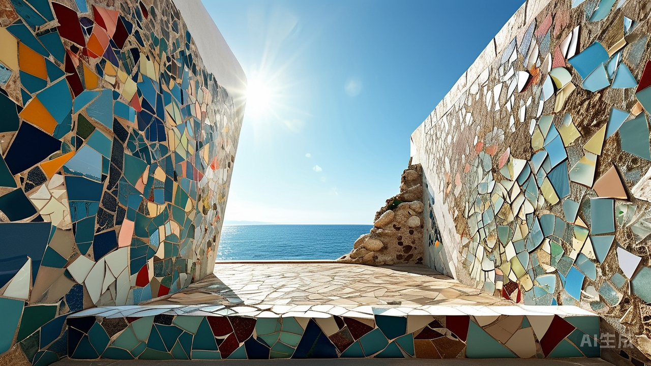 午后的阳光带着地中海的炽烈温度,慷慨地洒落。当光线撞上那些微微凸起或凹陷的瓷片表面,瞬间便激发出内蕴的璀璨,每一片碎瓷都仿佛活了过来,成为光线的微型舞池。整个墙面不再是静态的装饰,而是光与色的流动盛宴——冷峻的蓝因阳光的亲吻而变得温润,热烈的红在光的穿透下更显深邃。光在凹凸的瓷片间折射、跳跃、流淌,赋予墙面一种近乎生命的跃动与呼吸。 这面马赛克拼图,恰如地中海灵魂在石墙上的具象化。它并非用颜料涂抹的虚幻之梦,而是以破碎之瓷片聚合的永恒真实。每一片锐角被磨成圆润的弧度,深深嵌进墙体,以自身的斑斓与坚硬,抵御着海风的侵蚀与时间的剥落。色彩的狂欢在这里化为一种沉静的宣言,这不再仅仅是匠人手底的工艺,而是一场将明澈阳光永久封存于庭院的魔法——凝固了海的呼吸,也镌刻了南欧不灭的明亮温度。