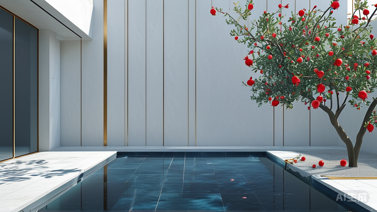 在极简基底中植入一块艺术花砖,成为整个空间的视觉引爆点。四壁皆是素白,空无一物。水磨石地面冰凉平滑,映着清寂的光线。几道极简的直线框出空间筋骨,冷静得近于虚无。 目光漫游间,足下忽地一烫——地面中央,竟嵌着一方异域的陶土花砖。那砖仿佛自波斯古窑灼灼坠落于此,釉色浓烈如深海凝结的蓝,又似陈年血珀。藤蔓蜿蜒纠缠,金线勾边的石榴花苞半绽,沉甸甸欲坠。时光的琥珀在此凝滞,繁复的曲线如生命暗涌,寂静地撕开了素白的幕布。