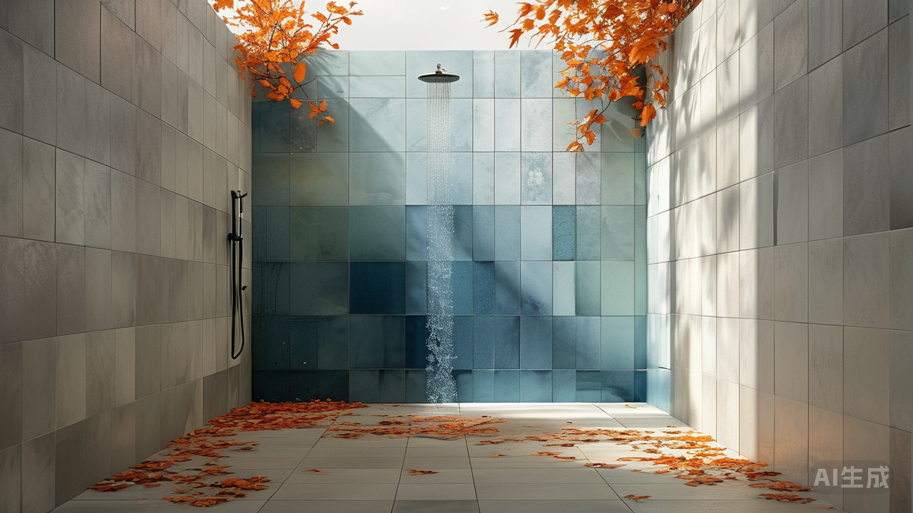 跳色砖则另有一重妙处,其色非为撞色,而是同谱系里更轻俏或更深沉的几缕。譬如一片铺排开来的浅灰哑光砖,于靠近墙根处,蓦然化入了一两枚灰蓝。那蓝并非刺目,只如天光映水般悄然晕染开来,又像是灰色调里偶尔漫溢出的一痕湿润心事。再若木纹砖地面,竟有暖橘色小砖星点散落,仿佛是秋叶几片无意遗落,被时光轻轻压入了地面纹理的肌理中。在淋浴区墙根,一溜米白墙砖中偶然遇见一列窄窄的孔雀石绿,如石隙里蜿蜒的细流,正待你俯首或凝视时,才恍然惊觉它的存在。