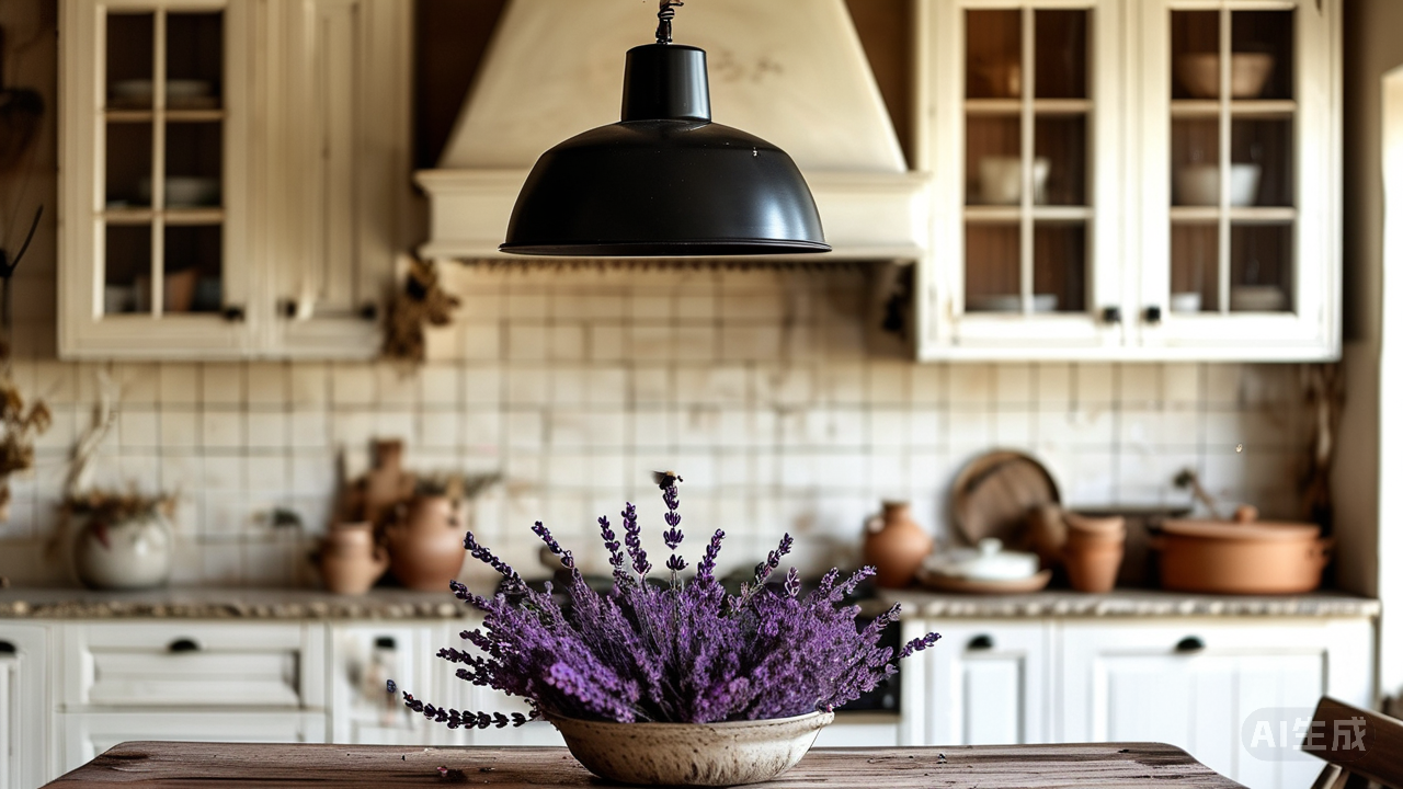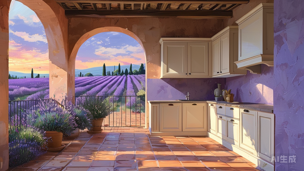 打造南法普罗旺斯风情的厨房:手工感陶砖与薰衣草色系的融合。普罗旺斯的灵魂,大约是被一双勤勉的手捏进陶土,又让薰衣草的紫色浸透了的。当这样的灵思渗入厨房,便酿出了一方远离城市烟火的所在。 地面铺陈的手工陶砖,正是这种灵魂的起点。一块块砖体边缘并非刀裁般齐整,反带着窑火锻造出的微妙起伏与弯曲;釉面也并非如玻璃般光滑,而是隐约起伏着肌理,如同农人粗粝而温暖的掌纹。赭石、暖橙、大地褐与柔和的灰紫在其中交织融合,踩上去,足下便有了南法乡野泥土的厚重与温润,仿佛能感觉到橄榄树根在地底深处的呼吸。赤脚踩在上面,足底便与那些陶土深处贮藏的千年阳光相触,暖意自脚心蔓延,如同踏入一片被遗忘的古老葡萄园。