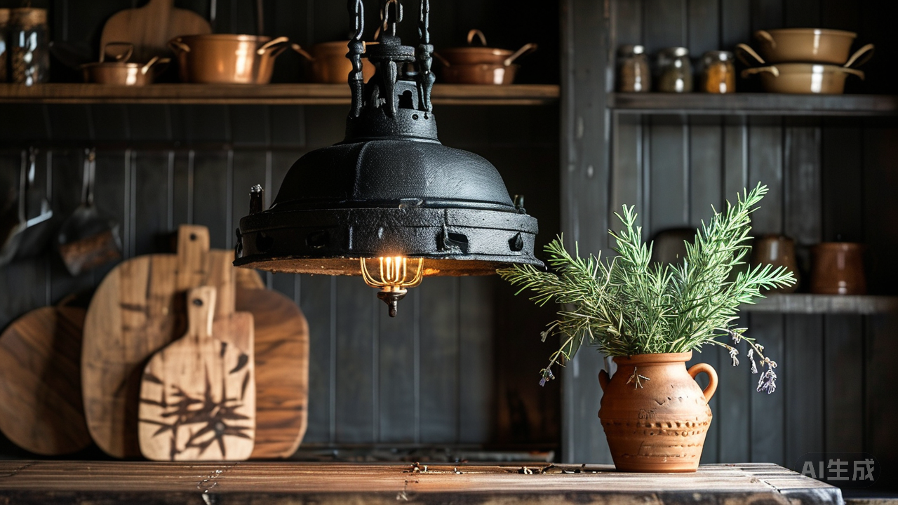 橱柜便选择了那温润的象牙白,略略带些岁月赋予的暖黄调子,仿佛被午后的阳光抚摸过多遍,边缘处甚至有意无意地留下些许斑驳的痕迹,如同旧书页边角的微卷与泛黄。木纹在其下隐约起伏,温润的线条与陶砖的拙朴、墙色的柔美自然衔接。几盏黑色锻铁吊灯从高处垂落,线条粗犷有力,灯罩却是柔和的磨砂玻璃,为这方烟火之地增添了几分山居的古朴况味。
