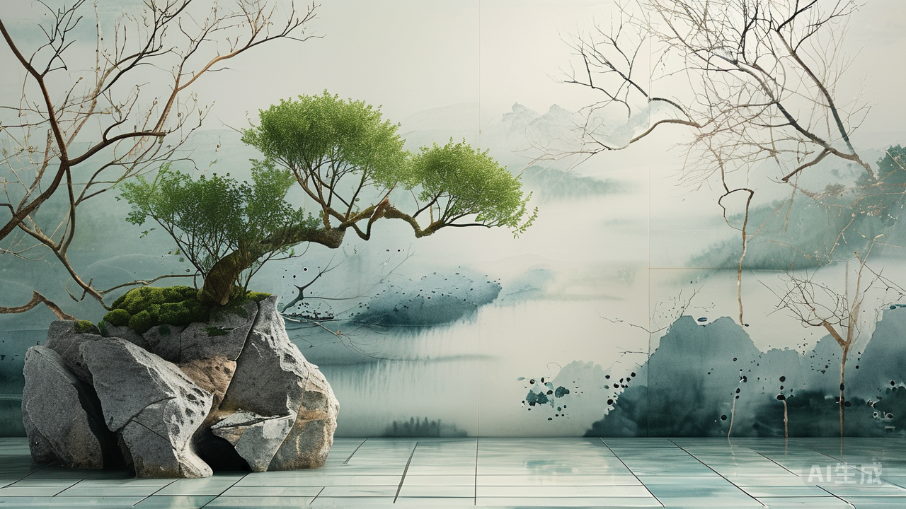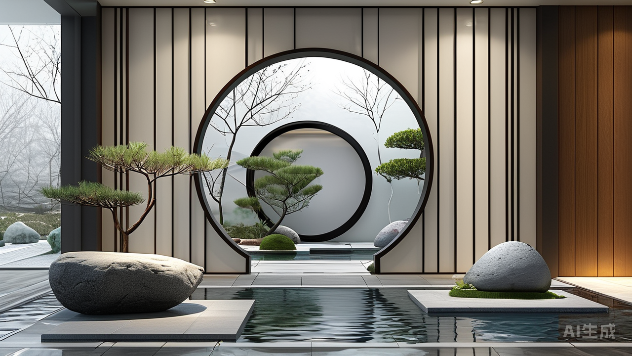若空间允许,一道月洞门或玲珑屏风浅浅隔断。人步入玄关,目光穿月洞而过,或于屏风间隙流转,那地上的画与石便恰如天然入框之景,层次顿生。这圆融孔窍本身亦成一道景,画外画,景中景,引人步入更深的幽邃。 新中式玄关这一隅迎宾景,绝非浮华点缀。它是归家时第一缕清气的抚慰,将市声喧嚣轻轻拂落门槛之外。那方枯山水是心池微澜,那幅瓷砖画是心壁所映,它们共同勾勒出一片无字之诗,以最简约的物语,迎候步履匆匆的尘心,令人在喧嚣深处,得一瞬回归古意的清平。