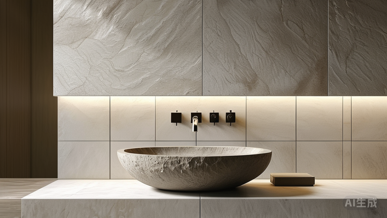 轻奢风卫浴的极致体验:一体式岩板台盆与墙面瓷砖的统一设计。推开门扉,整个空间便以极致的统一感无声包裹而来。岩板台盆并非孤悬的器物,它自墙面延展而出,似自然生就的肌理,与垂直铺展的墙面瓷砖浑然一体。线条在光线下悄然隐没,视野无遮无拦地延展开去——墙壁与台面在此处完成无声的交融,轻奢空间的精髓,便在这无垠的纯粹中悄然绽放。 一体式的岩板台盆在此时显出非凡的质地:凝脂般的触感温润如玉,釉面流转的光影似静谧水流。而墙面瓷砖亦非配角,它们以同色系或同材质铺陈开去,纹路仿佛自台盆处向上生长、蔓延。材质界限消融,空间仿佛被无形之手拉伸延展,视觉的纵深感由此而生。置身其中,身心仿佛也随之沉入一片纯粹无垠的宁静之境。当材质疆界弥合,空间便获得了呼吸的自由,亦将轻奢的精髓——那份不张扬的雍容,沉淀为触手可及的日常。