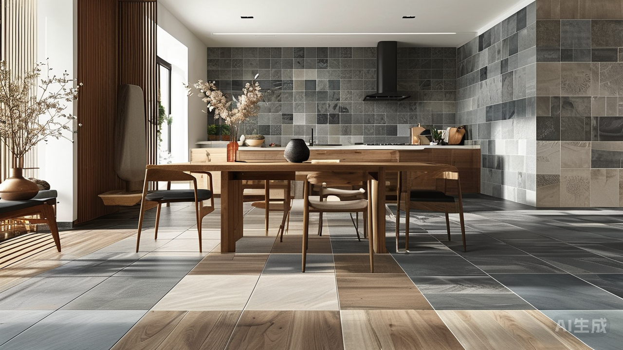 如何利用瓷砖定义不同的功能区域,实现开放空间的隐性隔断?在开放格局中,空间自由流淌,但功能却渴求清晰的界限。如何无形中圈定不同生活场域?瓷砖,这脚下的艺术,便能以无声之语完成空间的精妙对话。 **色彩与图案,是瓷砖最直白的语言。**客厅地面延展着温和木纹砖的暖意,当视线随着步伐游移至用餐区,沉稳的深灰岩板质感便悄然铺设开来。这明与暗的交界处,无需墙壁,脚步与目光自然减速,空间身份已了然于心。色彩对比之下,功能区隔便在无声中完成。