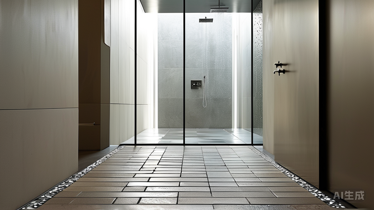 **高度与边缘的微妙抬升,塑造出视觉上的场域感。**卫浴空间中,淋浴区下沉的几公分,边缘镶嵌一道醒目的金属收边条。这小小的“门槛”在安全之外,更如一道低调的视觉信号——水汽氤氲的私密空间由此开始。地面瓷砖的高低错落,无声诉说着功能的分野。