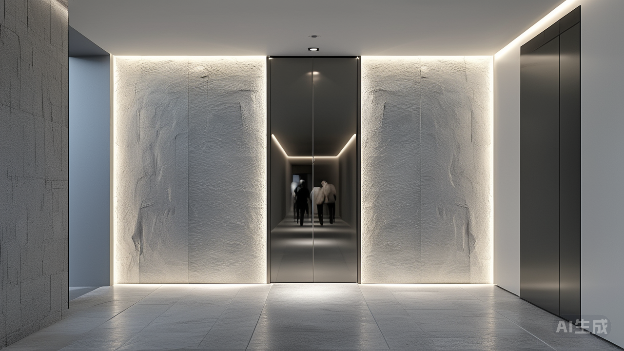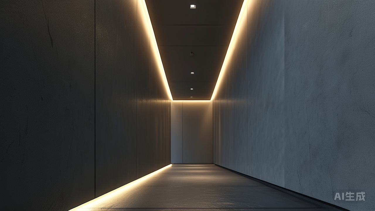 在廊道的尽头,设计师巧思暗藏。地面哑光深灰砖与墙面交接的阴影处,一条窄窄的嵌地灯带无声蛰伏。它悄然释放出微光,并非指向脚下,而是轻柔地向上漫溢,为深沉的砖面镀上一条流动的光边。夜行至此,这点点微光如星河铺路,既驱散了深暗的压迫,又为空间添上一抹未来之笔。这藏于暗处的温柔,是对脚踏实地的安全感的诗意诠释。
