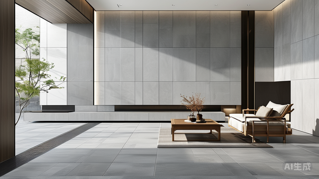 除了鲜明的冷暖对比,中性色瓷砖扮演着空间中的定海神针。高级灰早已超越了“单调”的刻板印象,它理性、优雅且极具包容性。大面积的灰色瓷砖奠定了空间的现代与静谧基调,它不抢风头,却能完美衬托家具与艺术品的质感,赋予空间一种深思熟虑的精致感。纯粹的白色瓷砖则象征着极致的光明与纯净,它能最大化地反射光线,让狭小的空间显得开阔明亮,带来整洁、空旷和无限可能的心理暗示。然而,过度的白色也需用木质或织物来调和,否则可能产生冰冷与疏离感。